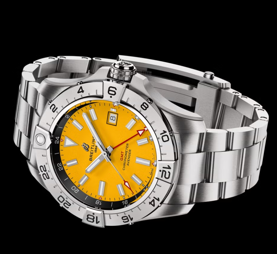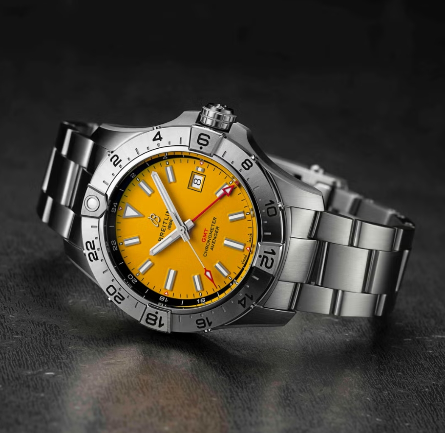 Produced exclusively for the UK retailer, it revives one of Breitling’s most recognisable codes – the bold yellow dial first seen in the 1950s – and applies it to a modern GMT travel fake Breitling watches for sale.