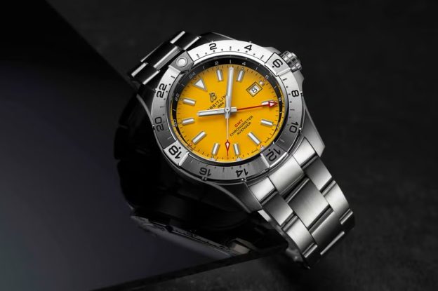 Produced exclusively for the UK retailer, it revives one of Breitling’s most recognisable codes – the bold yellow dial first seen in the 1950s – and applies it to a modern GMT travel fake Breitling watches for sale.